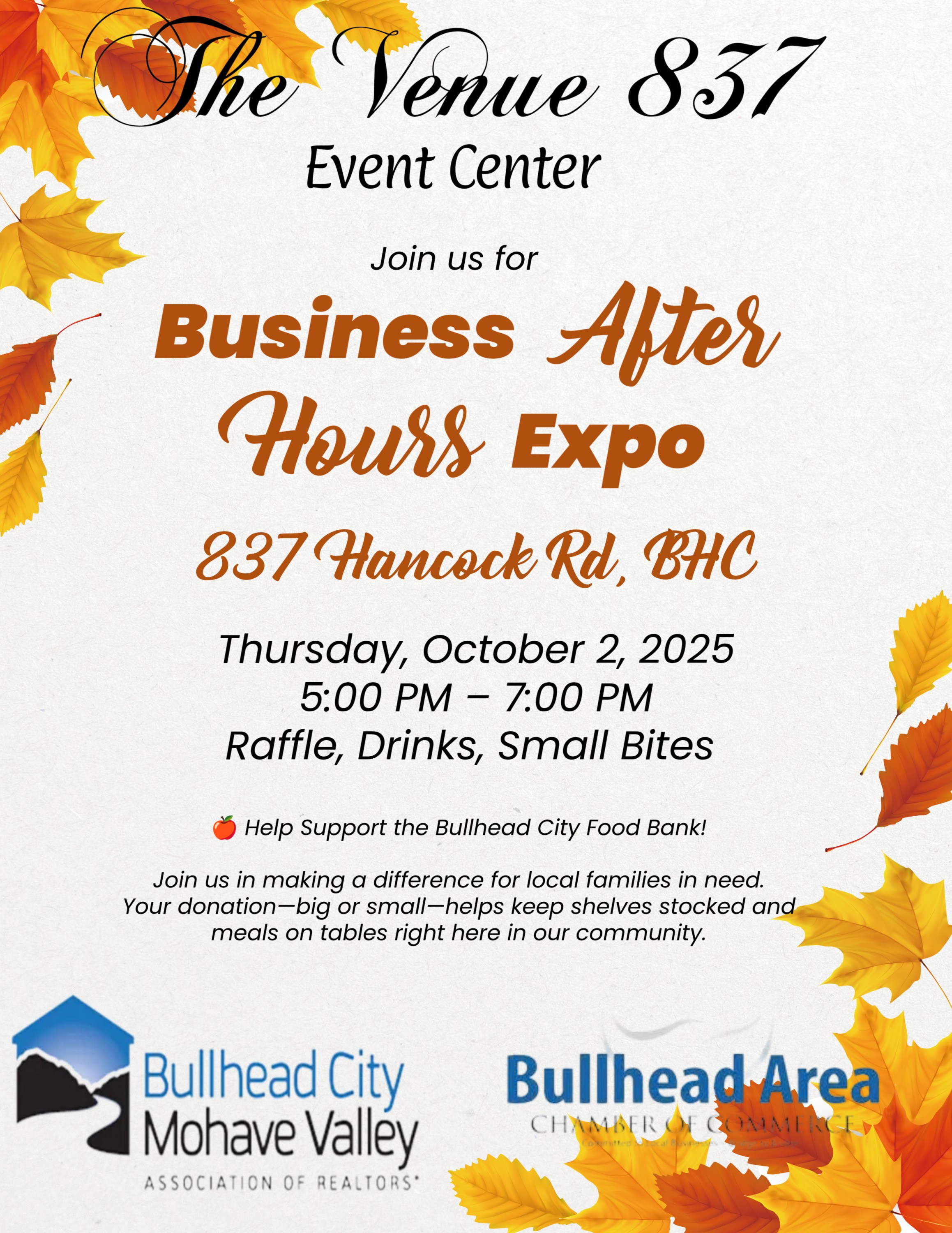 Join us for an evening of networking, community, and fun at the Business After Hours Expo, proudly hosted by the Bullhead City Mohave Valley Association of REALTORS® & The Venue 837 in partnership with the Bullhead Area Chamber of Commerce.