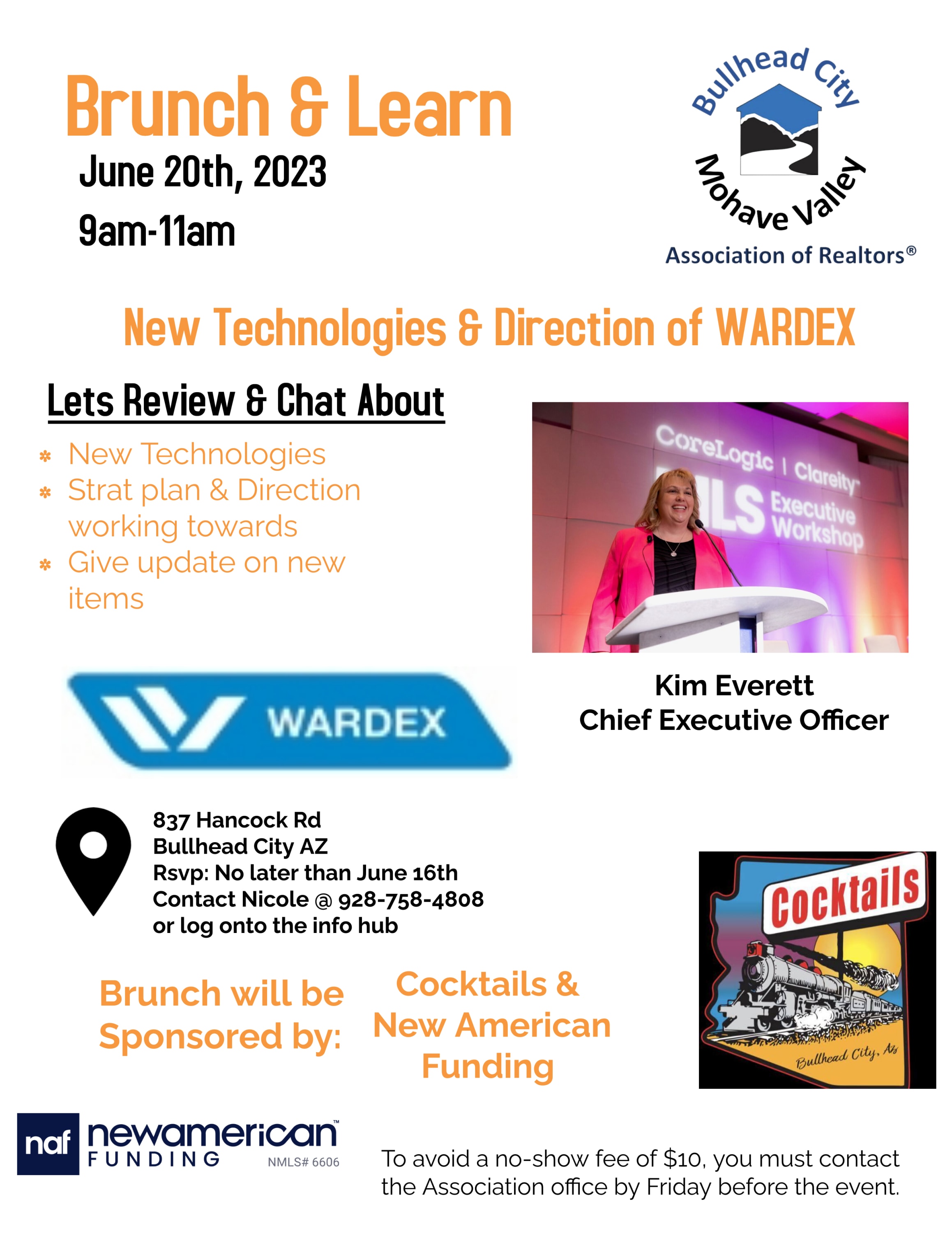 June’s brunch and learn will be with Kim Everett CEO of WARDEX. She has a fun and exciting morning planned out. She will be going over all things WARDEX including the new technologies that have arrived, Strat plan and Direction where WARDEX plans to go in the next couple of months as well as new updates on some new items coming to WARDEX. Brunch will be severed and sponsored by Cocktails and New American Funding. Sign up today