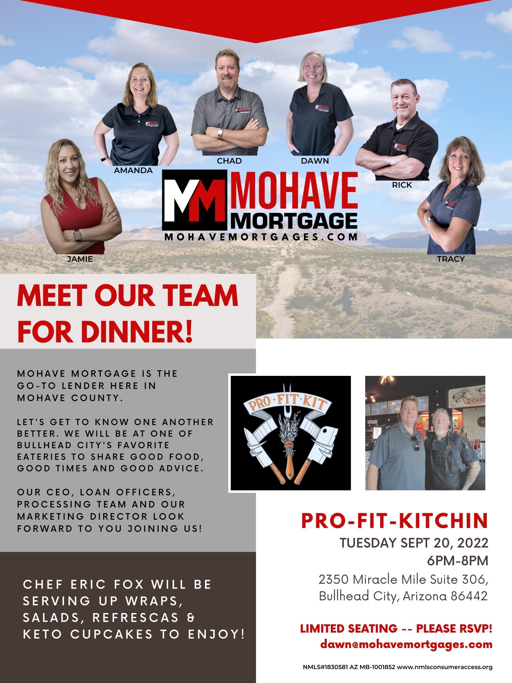 Meet Mohave Mortgage for team for dinner. Dinner will be at Pro-Fit-Kitchen, seats are limited! please contact Dawn Hansen if you have any questions.